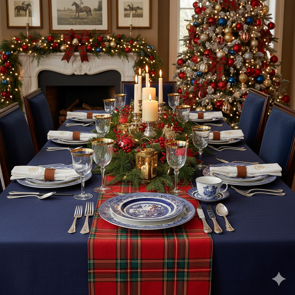Un estilo clásico, elegante y lleno de herencia visual. Predominan el rojo profundo, el azul marino y el dorado, acompañados de textiles tartán, detalles en cuero, candelabros robustos y elementos ecuestres. Es una mesa cálida, tradicional y muy sofisticada. La vajilla Blue Willow de Oxford Porcelanas aporta el acento perfecto para este universo atemporal.