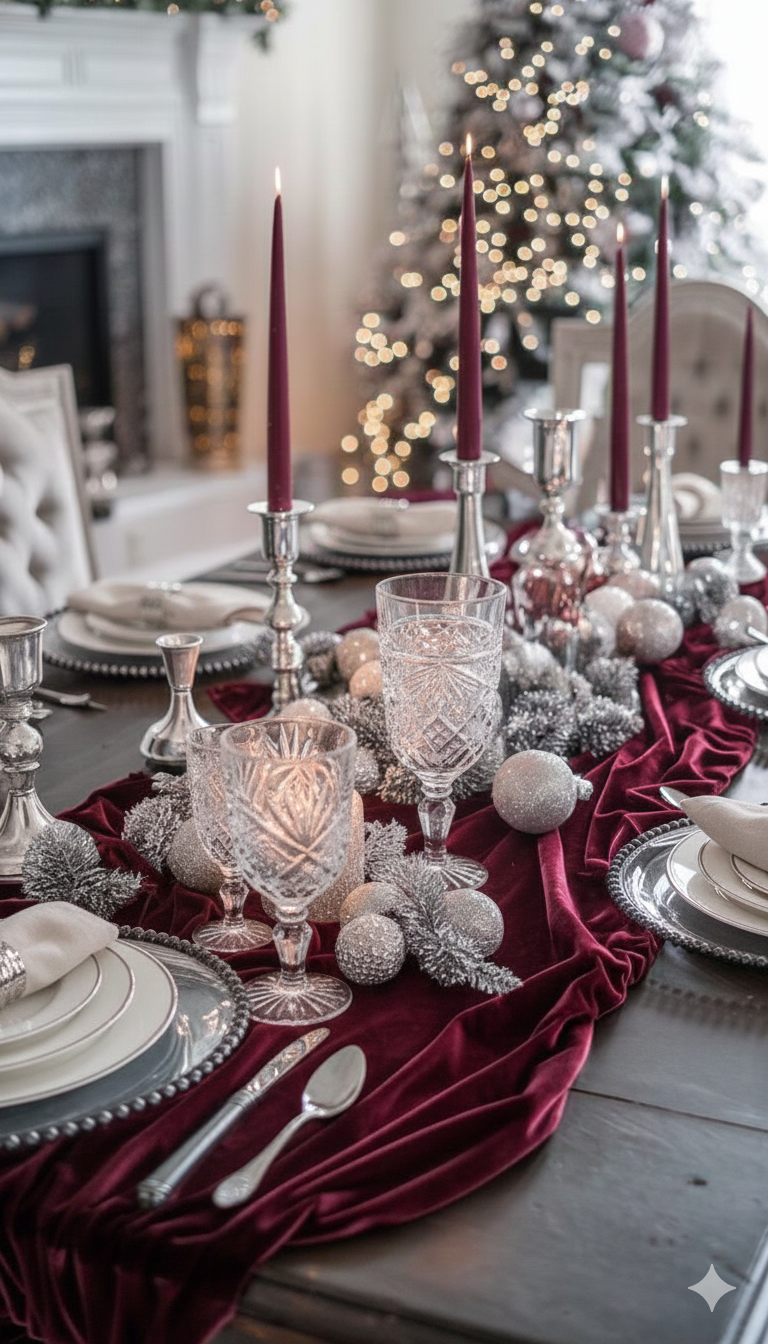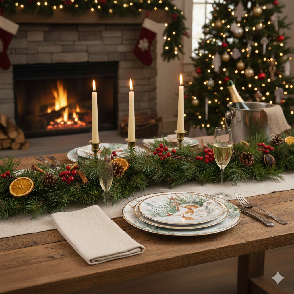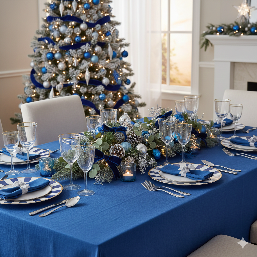 Una propuesta invernal y luminosa basada en azules, blancos y plateados. Es ideal para quienes buscan una Navidad fresca, con guirnaldas nevadas, cristalería transparente y ornamentos metálicos fríos. Funciona muy bien con vajillas Blue Stripe, Blue Willow o Chinese Blue, manteniendo la armonía monocromática que caracteriza la tendencia.