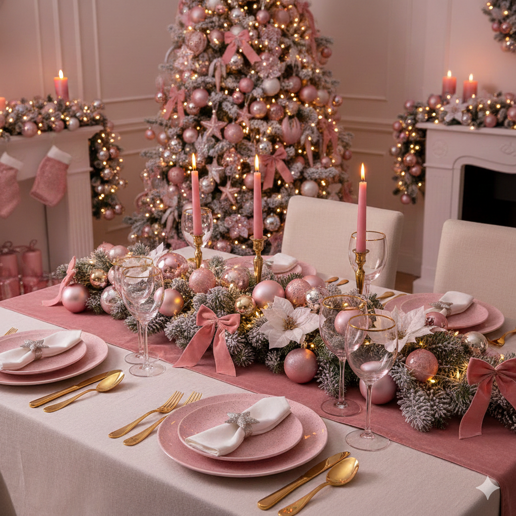Una Navidad suave, dulce y romántica. Predominan los tonos rosa pastel y rosa viejo combinados con blanco y dorado. Esferas rosadas, lazos, velas delicadas y detalles brillantes construyen una estética tierna y femenina. La cerámica rosa de Oxford Porcelanas o la línea Pink Sand son ideales para este ambiente encantador.